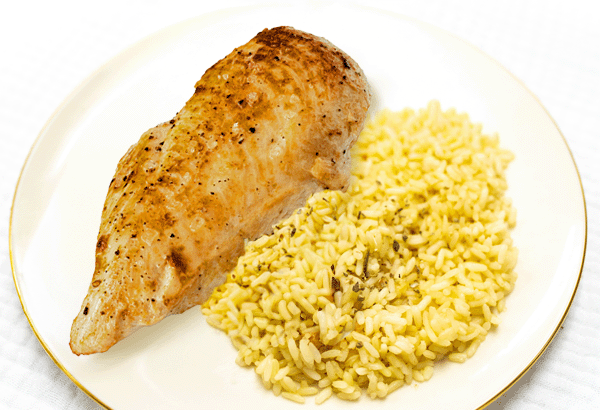 Traditional Greek seasoned chicken breast served with rice pilaf.